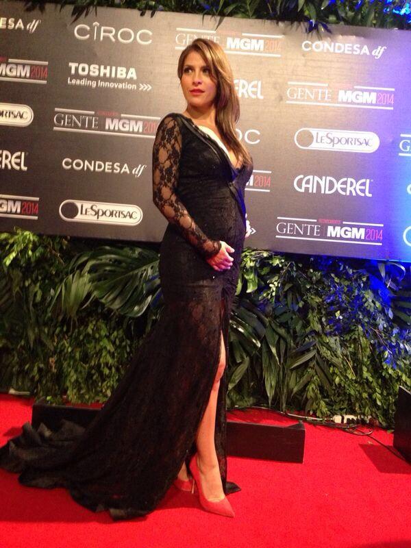 Ataviada en un traje negro forrado en encanje, la esposa de Eugenio Derbez mostró su creciente pancita en esta alfombra roja que tuvo lugar en el centro de espectáculos Plaza Condesa. La actriz y cantante le dio un toque de color a su atuendo con pumps y labios en fucsia.