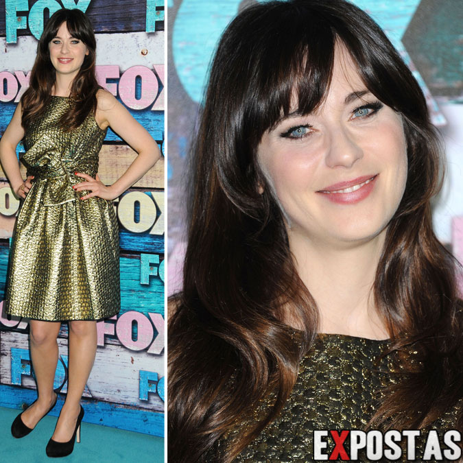Zooey Deschanel en la fiesta de las estrellas de FOX (o FOX All-Star Party, como te guste más) en West Hollywood. La actriz lució un vestido dorado y bastante conservador, con zapatos de terciopelo negro.